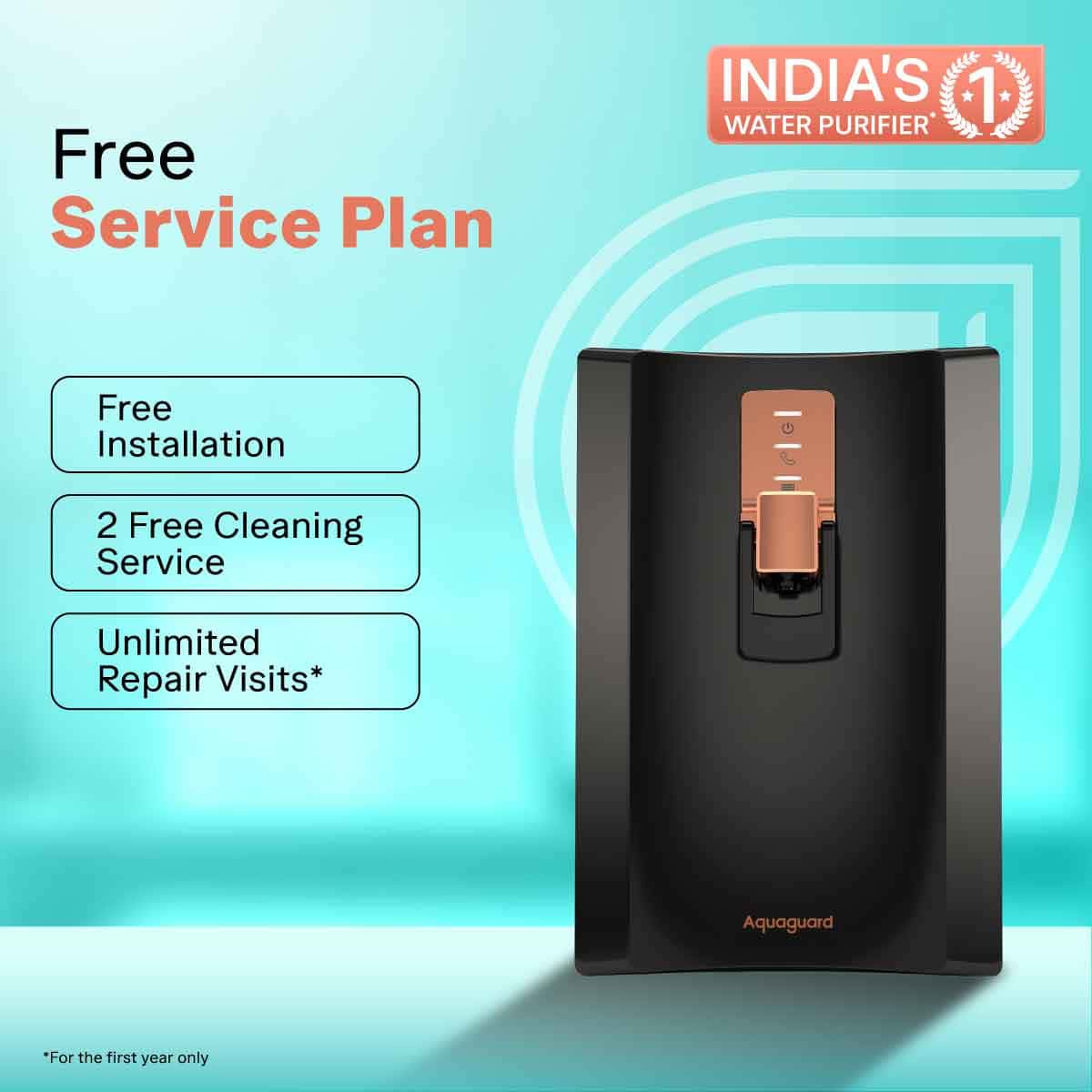 Free Service Plan – Comes with Aquaguard genuine service plan offering free installation, 2 free cleaning service, and Unlimited Repair Visits* (*Valid for the first year only)