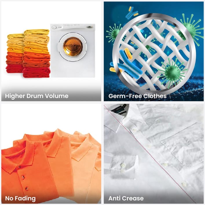 | Other Features | Drying Program (Mixed Load, Cotton, Synthetic), Cool Down Time: 13 min, Wall and Machine Mountable, Drying Capability: 100%, Germ Free Clothes |